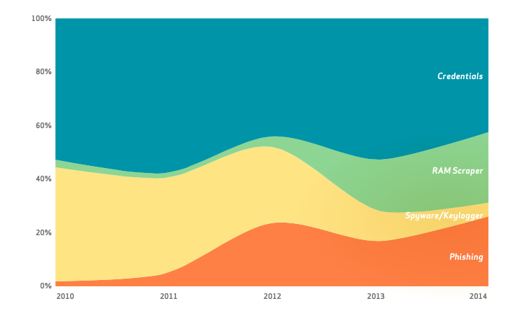 First, I learned that Verizon publishes an annual report on data breach. This report which is written wittily and is easy to read (thank goodness for that) gives you a clear picture on main security breaches across different industries and platforms (desktop, mobile, Internet of Things). The following graph shows the breach trends over the past 5 years and for me it was one of the most interesting graphs through out the report. As you see RAM scraping and Phishing are major and growing problems: